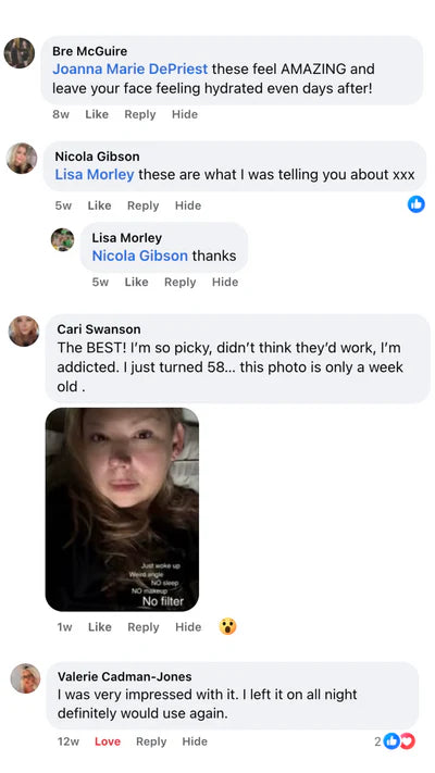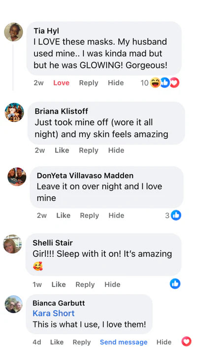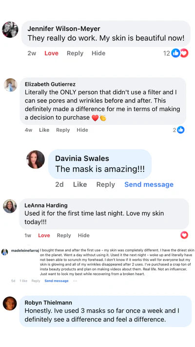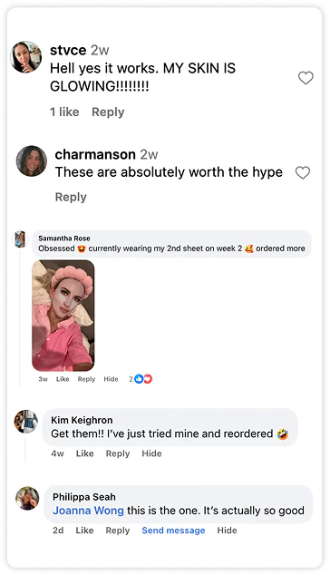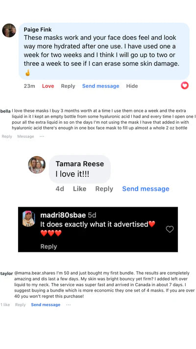 Our mask is infused with 40g of concentrated collagen serum and advanced K-Beauty ingredients that deeply hydrate, firm, and lift the skin. It also uses our Perfect-Fit No-Slip Technology to stay comfortably in place for full absorption.